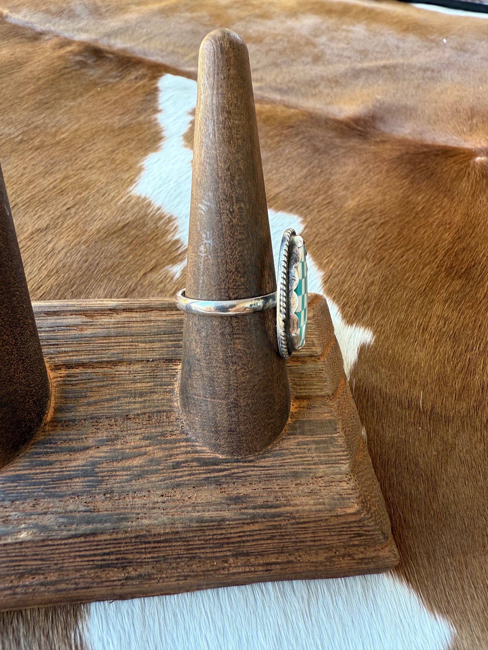 Sterling Silver Blue/White Checkered Ring. Polished/Patina Finish.